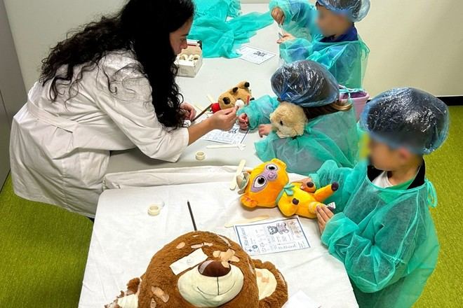 Durante su visita al hospital ficticio, los niños tienen la oportunidad de vacunar a sus peluches y llevar a cabo exploraciones físicas utilizando material médico como martillos reflejos y fonendoscopios. En la sala dedicada a radiografías, pintan las lesiones que aparecen en las imágenes que muestran el esqueleto de sus juguetes. Por otro lado, en el quirófano simulado, los pequeños realizan curas y operaciones. En este escenario, se visten con batas verdes reutilizables y utilizan barretinas y mascarillas desechables.