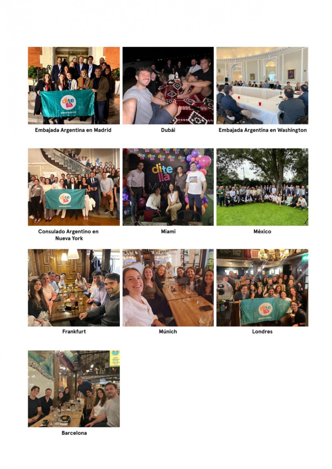 Cada encuentro presentó dinámicas variadas; algunos se enfocaron en el networking dentro de un marco institucional, mientras que otros adoptaron un enfoque más relajado, como cenas o brindis en bares. Cada uno de estos eventos ofreció una oportunidad invaluable para fortalecer vínculos, intercambiar experiencias y dialogar con otros graduados que residen fuera del país.
