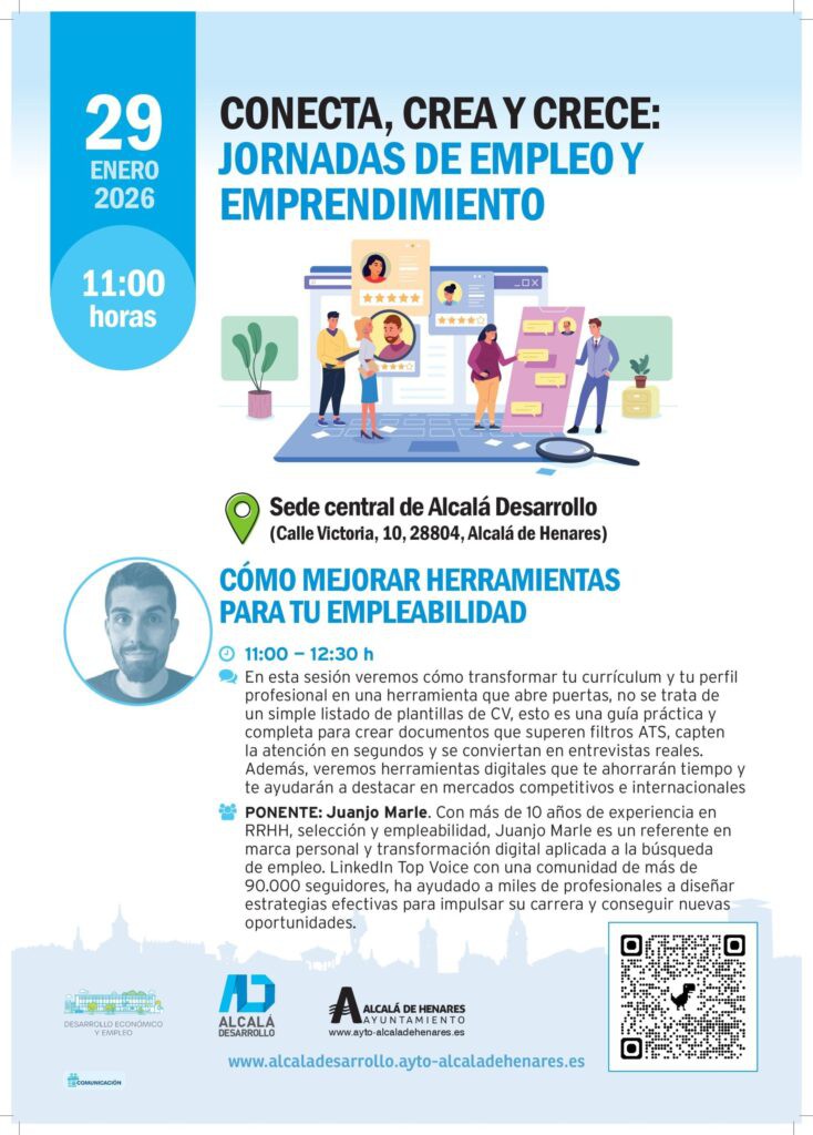 El Ayuntamiento de Alcalá de Henares, a través del ente público Alcalá Desarrollo, llevará a cabo el próximo jueves 29 de enero, de 11:00 a 12:30 horas, una nueva sesión del ciclo formativo “Conecta, crea y crece: jornadas de empleo y emprendimiento”. Esta jornada, titulada “Cómo mejorar herramientas para tu empleabilidad”, se celebrará en la sede central de Alcalá Desarrollo, ubicada en la Calle Victoria, 10.