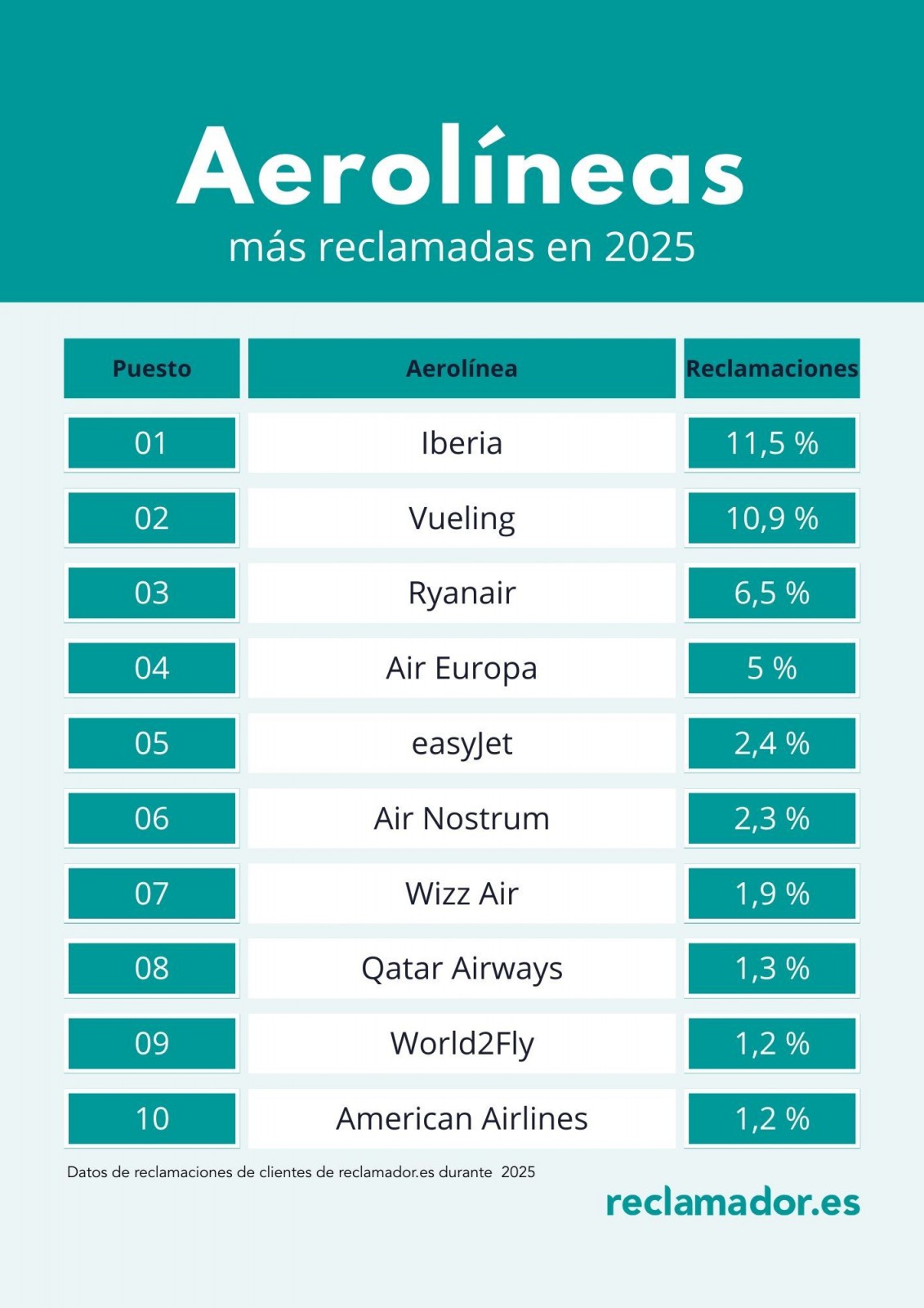 En cuanto a otras aerolíneas con mayor volumen de quejas, destacan Air Europa (5 %), easyJet (2,4 %), Air Nostrum (2,3 %), Wizz Air (1,9 %) y Qatar Airways (1,3 %).
